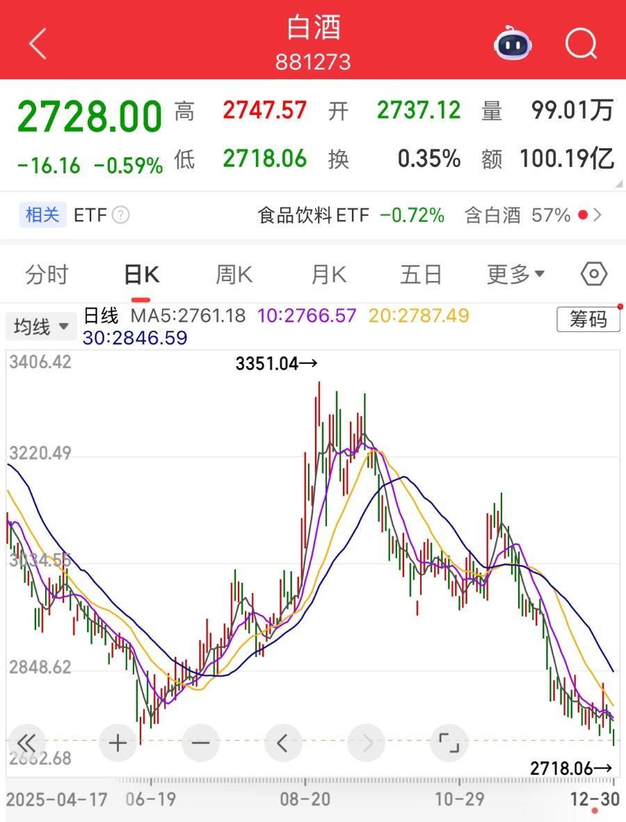 12月30日,同花顺白酒指数(881273.TI)下跌0.59%,盘中一度触及2718.06点浙商证券证交所,跌破此前2719.97点的低位,创下年内新低。